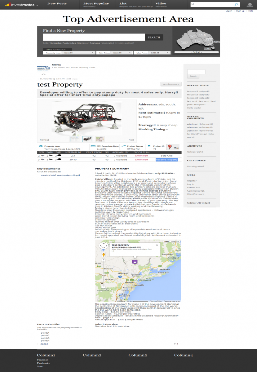客户的投资模块是一个非常重要的需求,我们采用自定义模块的方式,灵活加入后台管理在结合WordPress本身钩子Api满足扩展字段的需求,在定制的property模块中客户可以上传文件,图片指定property的地点,洲际以及各种相关的细节字段并且可以灵活扩展添加多字段。内置地图功能,利用map接口插入property的信息。